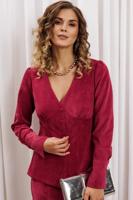 Блузка оригинальная приталенного силуэта из вельветовой ткани. Перед с подрезом под грудью, сборкой в районе груди и талиевыми вытачками. Затсежка на петли и пуговицы. Горловина V-образной формы. Спинка со средним швом и талиевыми вытачками. Рукав втачной со сборкой по окату и с манжетой по низу. Манжета высокая с двумя петлями и пуговицами. Длина блузки - 63 см, длина рукава блузки - 64 см. Изделие подходит на рост 164-170
