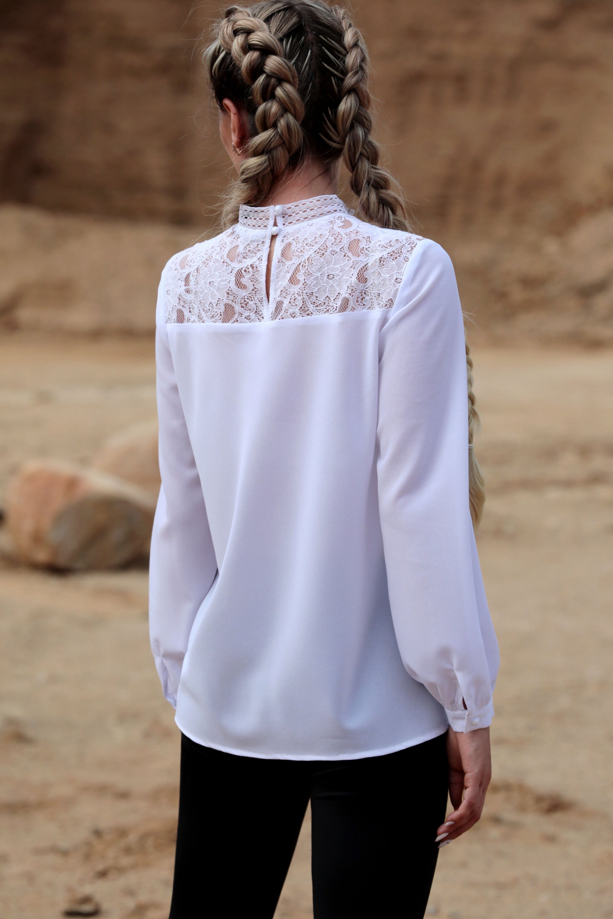 Блузка с застежкой на навесную петлю и пуговицу по стойке спинки. По переду с отрезными фигурными кокетками и вставками из кружевной тесьмы. Спинка со средним швом, отрезной кокеткой. Кокетка спинки с разрезом от горловины