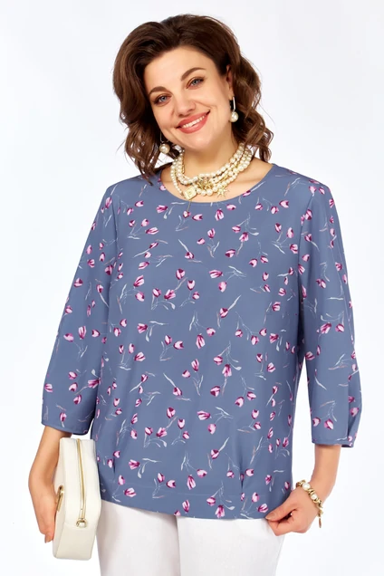 Блузка женская, полуприлегающего силуэта. Перед с нагрудными вытачками , идущими от центра груди к боковым швам. По низу переда расположены 2 складки. Низ переда обработаны обтачкой. Спинка со средним швом. По низу в среднем шве расположен разрез. Сверху застежка на петлю и пуговицу. Низ спинки не ровный. Рукава втачные, 3\4, по низу рукава складка. Низ обработан окантовкой.