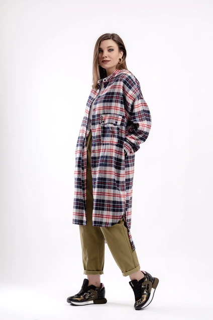 Рубаха из хлопковой ткани в клетку свободного покроя, низ ступенчатый перед до середины колена, спинка до середины икры. Рукав рубашечный длинный на фигурном манжете , воротник стойка, застежка потайная на петли-пуговицы. На левой полочке под грудью накладной карман с клапаном. Обтачка по низу спинки и отделочная деталь спинки по косой. В боковых швах карманы. Рубаха из 100% хлопка может служить как изделие первого так и второго слоя.
