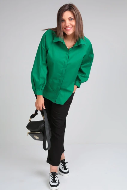 Ищите, где купить женскую рубашку из хлопка? Однотонная рубашка оверсайз стильного изумрудного цвета от нашего бренда - станет основой модного образа. Модель прямого силуэта, слегка расширена к низу. Длинный свободный рукав реглан, внизу рукава бантовые-складки, придающие рукаву объем, рукав заканчивается манжетой, застегивающейся на пуговицу. Необычность рубашке придает двойной воротник на отрезной стойке. Застежка центральная с потайной пуговичной планкой.