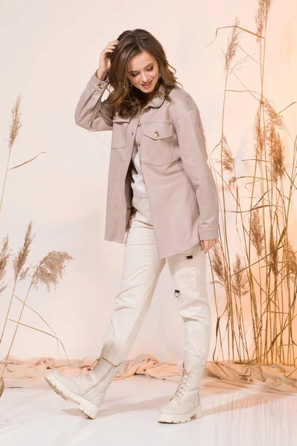 Эффектная рубашка-куртка (овершот), выполнена из текстильной ткани. Модель свободного силуэта, с отложным воротником. Застежка центральная, на петли и пуговицы. Полочка и спинка на кокетке. По полочке расположены накладные карманы с клапаном. Рукав втачной, длинный, на притачном манжете с застежкой на пуговку. Низ фигурный, по бокам расположены рабочие карманы. Спинка прямая. Отличный вариант по типу утепленной рубашки, ветровки. Длина – 75 см,