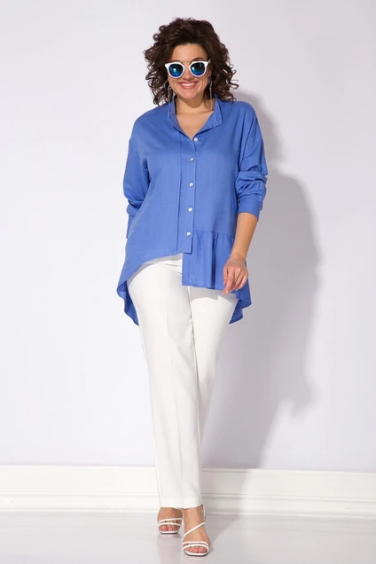 Эффектная рубашка в стиле БоХо, выполнена из льна в сочетании с вискозой. Модель трапециевидного силуэта, с ассиметричной линией низа. Перед короче, чем спинка. Застежка центральная с цельнокроеной планкой, с застежкой на петли и пуговицы. По переду ассиметрично расположена декоративная складка. Низ с ассиметричных рюшей. Спинка с отрезной кокеткой и заложенными складками на свободу. Низ овальной формы! Длина по спинке – 90, по переду - 60 см. Рукав – около 63 см.