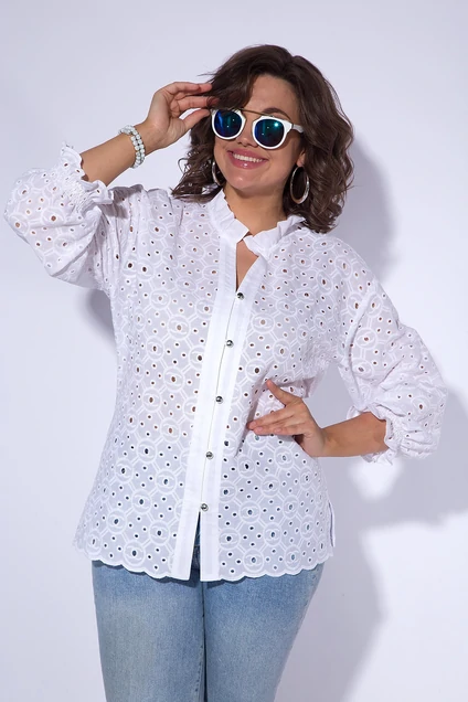 Классическая женская белая блузка с вышивкой ришелье «CHANEL» прекрасное дополнение к гардеробу любой девушки. Модель с широким рукавом длиной ¾-ти, присборен на манжет на мелкую резинку. Воротник в виде присборенной рюши, переходит в притачные планки и навесную застежку на петли и пуговицы. Спинка из
