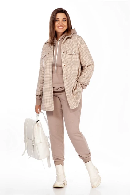 Рубашка женская, из приятного плотного трикотажного полотна, прямого силуэта, со спущенной линией плеча. Рукава втачные одношовные, низ оформлен манжетами с застежкой на пуговицу. Накладные карманы с клапанами по переду, рубашечный воротник, застежка на петли-пуговицы. Низ фигурный. В комплекте идет пояс из основной ткани, за счет которого можно придать дополнительное облегание. Длина рукава – 53см , ширина плеча - 22см.Длина изделия – 78см