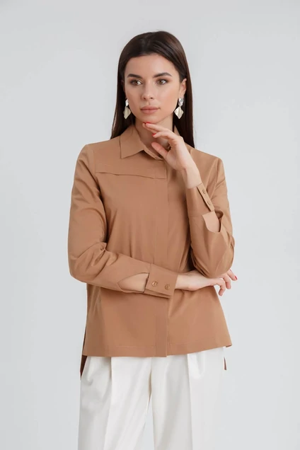 Рубашка прямого силуэта, с центральной застежкой на пуговицы в потайной планке. Отложной воротник-стойка. Передняя правая полочка с декоративной горизонтальной планкой. Притачные рукава с декоративным фигурным вырезом, на высокой манжете с застежкой на пуговицы.