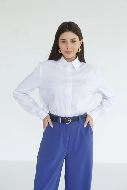 Базовая женская блузка рубашечного кроя в классическом белом оттенке, пуговицы скрыты в планке, длинный рукав, который можно закосать на удобную длину. Отличный вариант для ежедневных образов, красиво сочетается как с юбкой, так и с брюками.