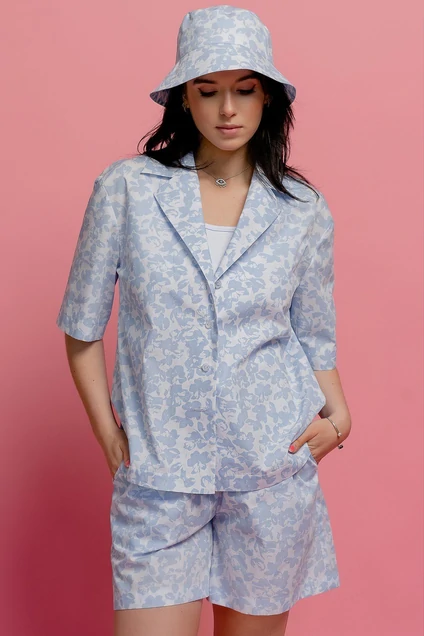 Рубашка жакет прямого силуэта из ткани с печатным рисунком и без,с рукавом рубашечного типа на спущенной линии плеча с воротником пиджачного типа с небольшими лацканами с центральной застежкой по переду.