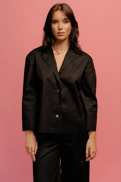 Рубашка жакет прямого силуэта из ткани хлопок,с рукавом 7/8 рубашечного типа на спущенной линии плеча с воротником пиджачного типа с небольшими лацканами, с центральной застежкой по переду.Отделка разные пуговицы.
