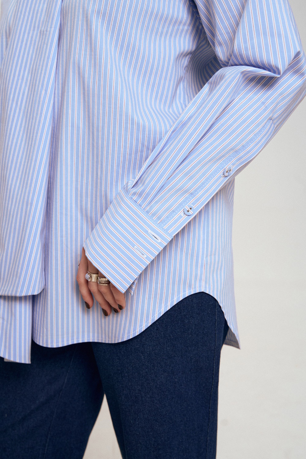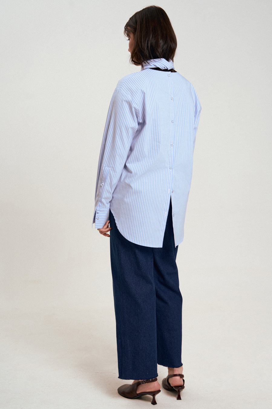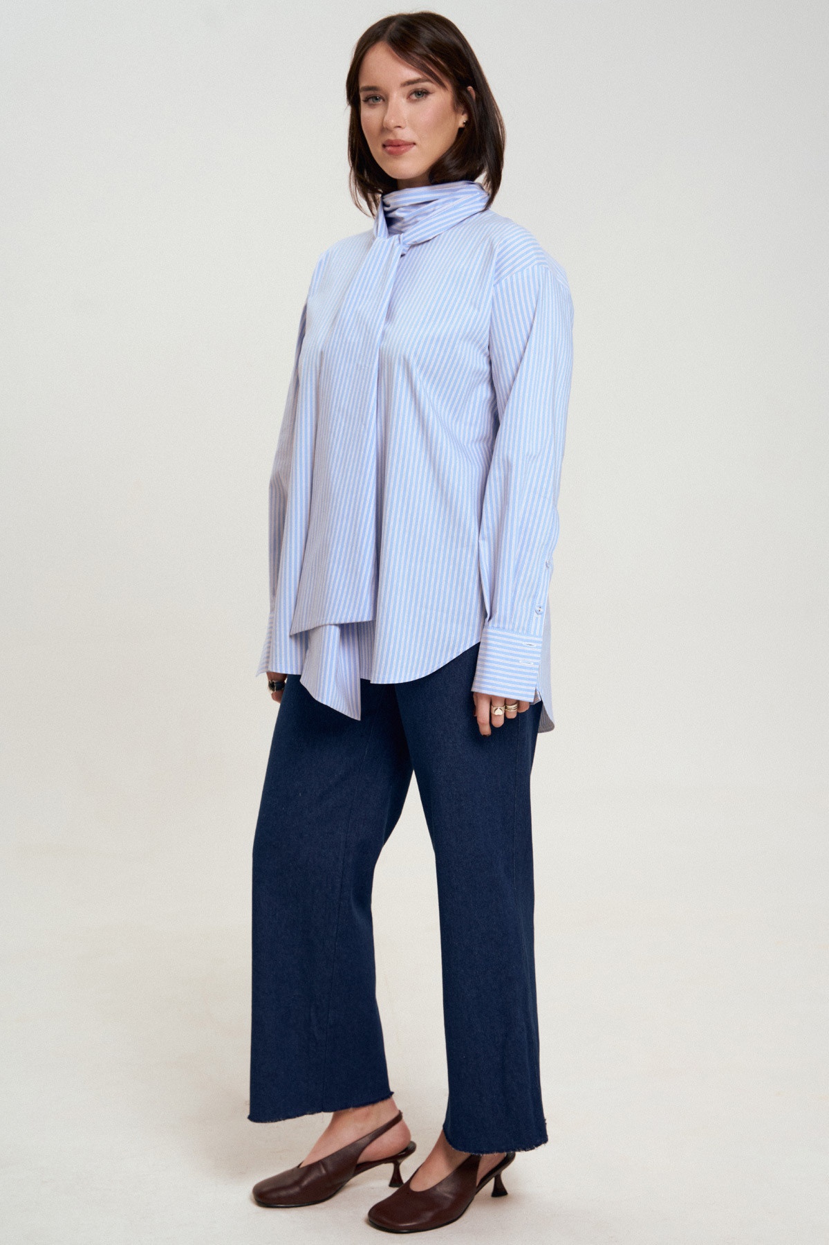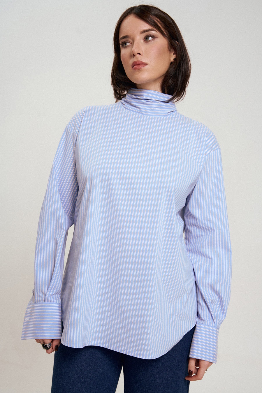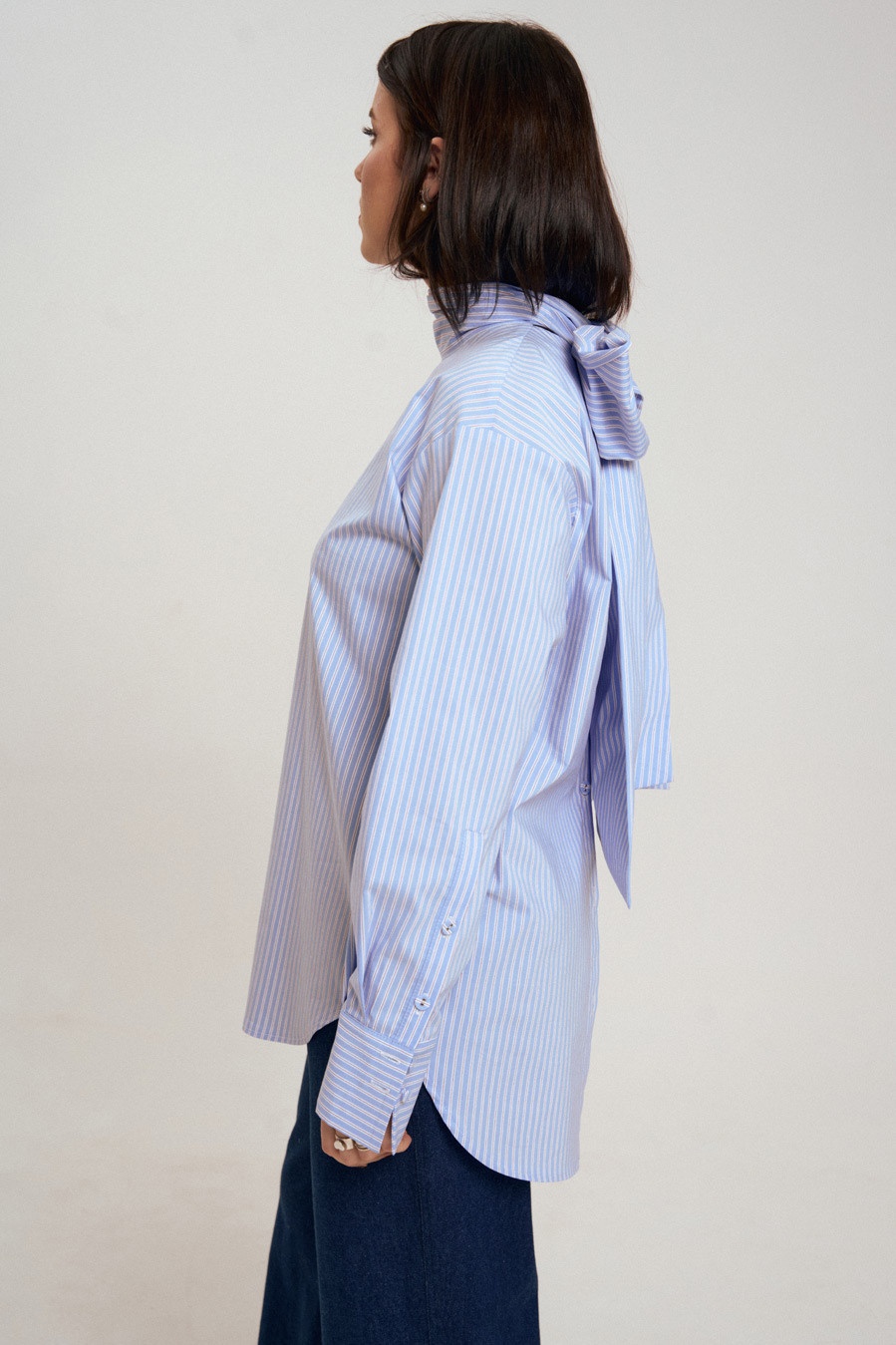 Блузка из ткани в полоску , прямого силуэта. С застежкой по спинке на петли-пуговицы( пуговицы обтянуты в ткань блузки) со спущенной линией плеча и манжетой по низу. Перед без швов,воротник стойка.Горловина округлой формы воротником шарфом втачен только по переду.Длина 76 см, ширина на уровне глубины проймы 55,57,59см, (42,44,46 р), ширина по талии 55,57,59см соответственно, ширина на уровне бедер 55,57,59 см. Длина рукава 60 см, длина банта 47 см.