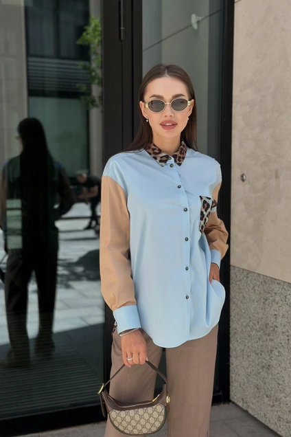 Блузка женская прямого силуэта, состоящая из трех видов ткани. Перед разрезной с нагрудным карманом, с центральной застежкой на петли и пуговицы. Спинка с кокеткой, по нижней части заложена широкая складка. Плечо спущено. Рукав длинный, по низу обработан широкой притачной манжетой, застегивающейся на петли и пуговицы. Низ закругленной формы, перед короче спинки. Горловина обработана воротником рубашечного типа с отрезной стойкой. Цвет материала может отличаться по тону в зависимости от настроек вашего монитора! Длина изделия по спинке 77,5 см, длина рукава от горловины 75 см.
