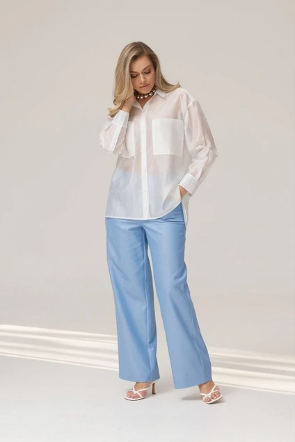 Блузка женская, прямая, с центральной застежкой на петли и пуговицы. По переду в области груди настрочены накладные карманы. Спинка с отрезной кокеткой, кокетка с центральной застежкой на петли и пуговицы. Нижняя часть спинки со складкой. Плечевой шов смещен на перед, линия плеча спущена. Рукав притачной, по низу обработан широкой манжетой, которая застегивается на петли и пуговицы. Горловина округлой формы, обработана воротниками (2) рубашечного типа с отрезной стойкой. По боковым швам отстрочены разрезы, перед короче спинки.Декоративные элементы и фурнитура могут отличаться от заявленных на фото. Цвет материала может отличаться по тону в зависимости от настроек вашего монитора! Длина изделия по спинке 78 см, длина рукава от горловины 73 см.