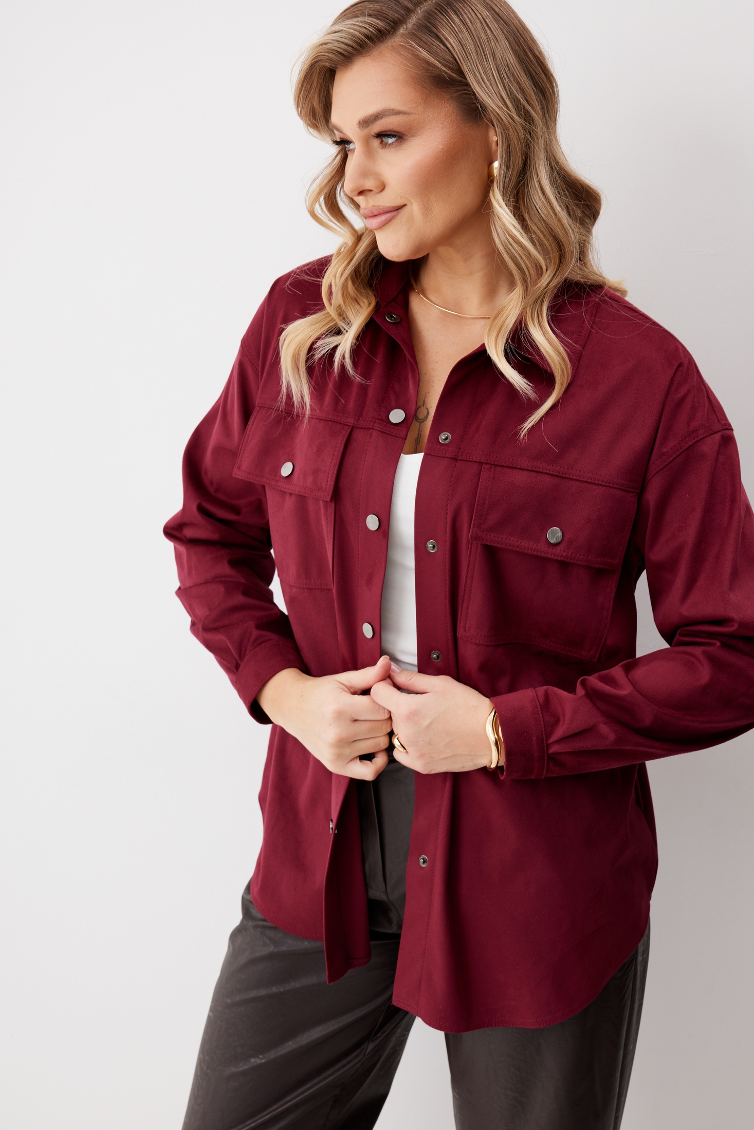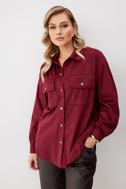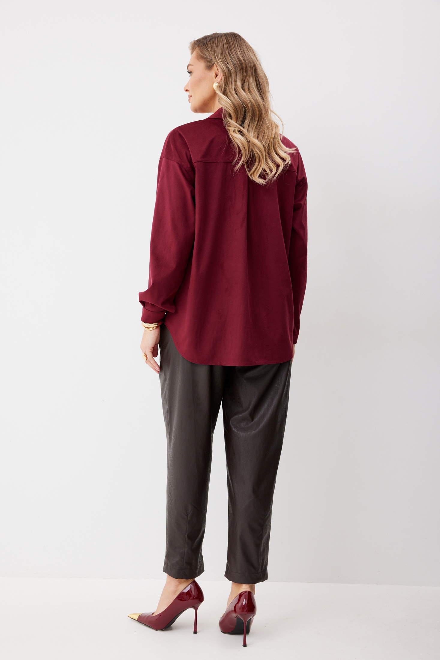 Блузка женская прямого силуэта из замшевой ткани длиной за линию бедер. По переду блузки отрезные кокетки и нагрудные накладные карманы с клапаном, застегивающиеся на кнопку. Спинка с отрезной кокеткой и встречной складкой. Линия плеча спущена. Рукав рубашечный втачной по низу с 2 –мя складками и отрезной манжетой, застегивающейся на кнопку. Воротник втачной рубашечный. Линия низа имеет фигурную форму. Воротник, кокетки, карманы, линия проймы отстрочены отделочными строчками. Застежка на кнопки центральная.Длина спинки изделия 73,5 см, длина рукава от горловины 77,5 см.