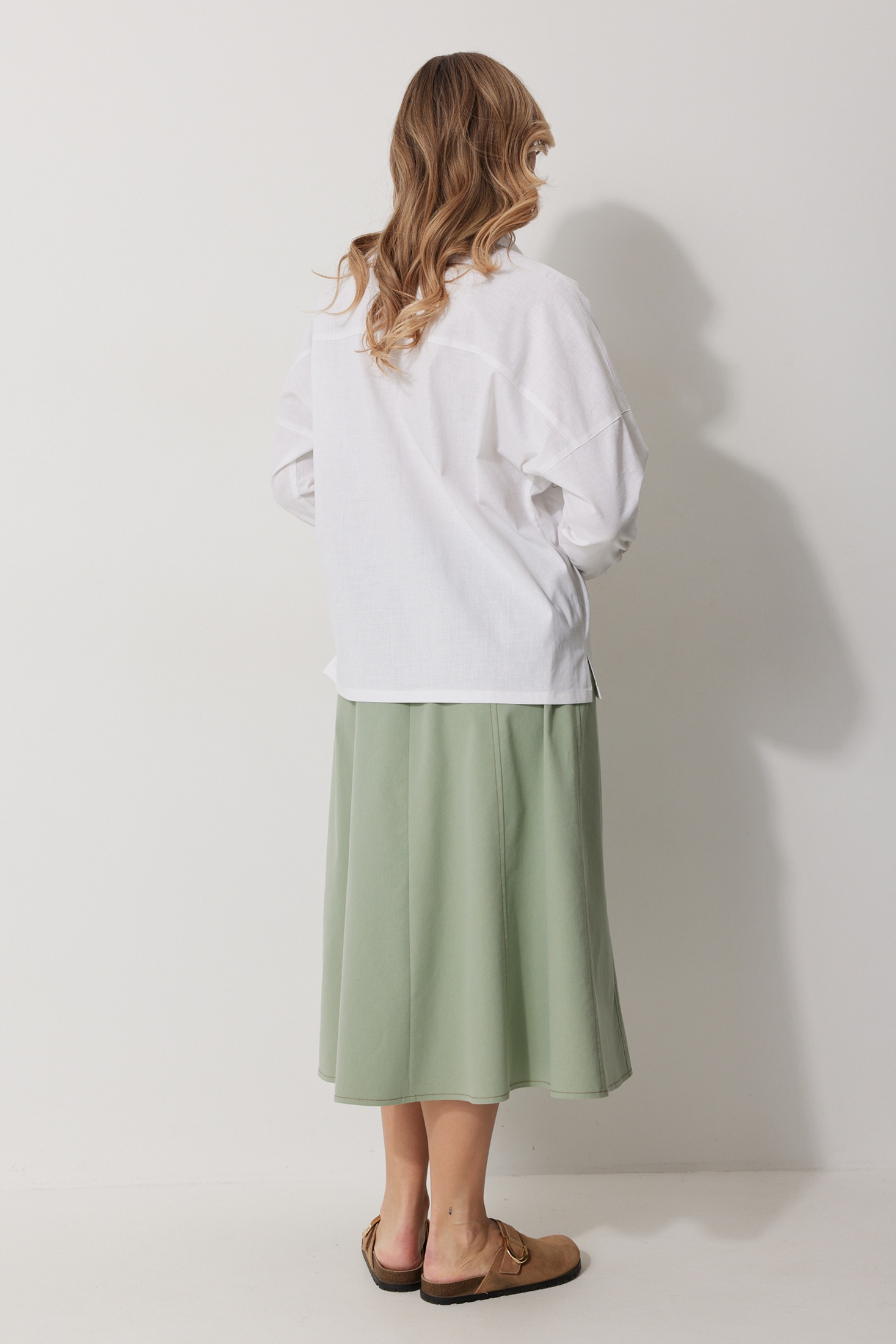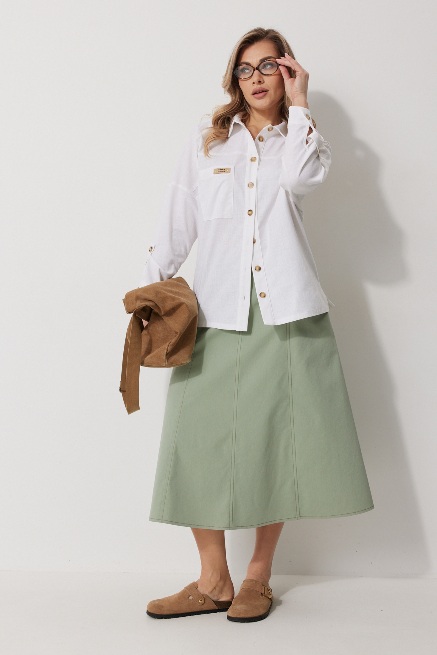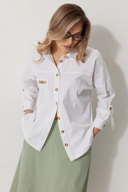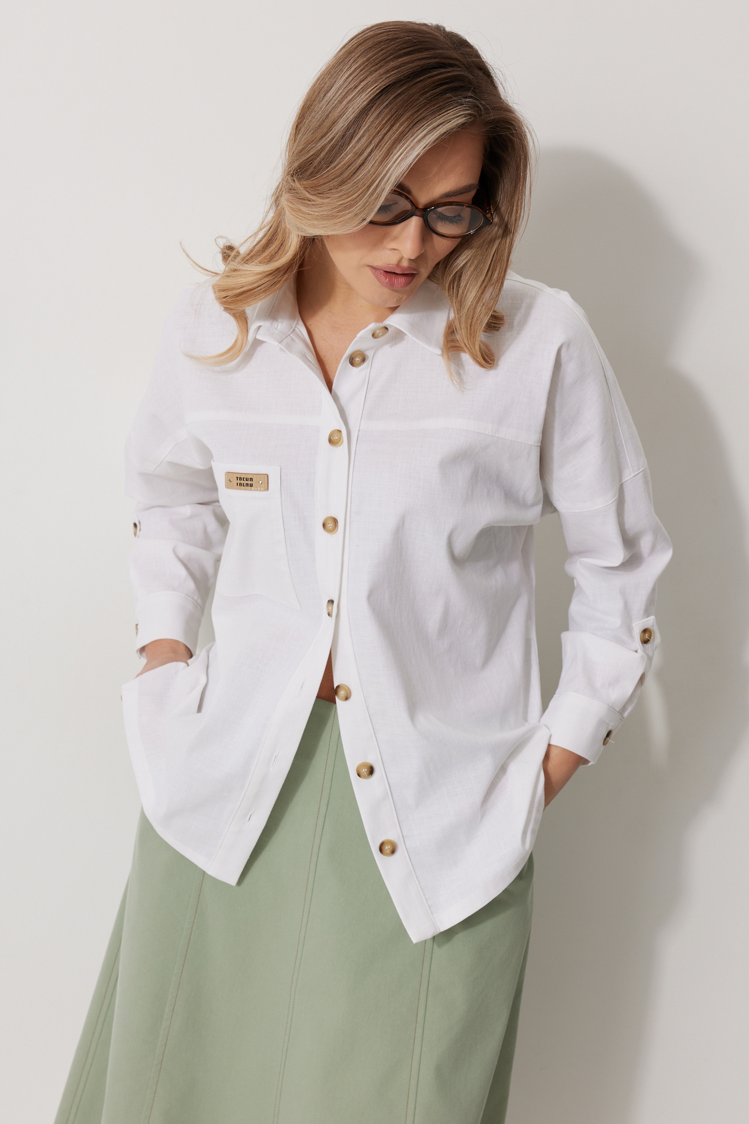 Блузка женская с рукавом и спущенной линией плеча длиной за линию бедра. По переду блузки обработана отрезная кокетка. Накладной карман расположен правой части полочки с декоративным элементом. По спинке блузки обработана отрезная кокетка. Рукав втачной рубашечный одношовный. Низ рукава со складкой, обработан притачной разъемной манжетой, застегивающаяся на петлю и пуговицу. В разрезе рукава пришита пата, застегивающаяся на пуговицу. Перед блузки обработан отрезными планками, застегивающимися на петли и декоративные пуговицы. Горловина обработана рубашечным воротником со стойкой. Подгибка низа блузки 1,5 см. По боковым швам блузки обработаны разрезы. Длина спинки изделия 62 см, длина руква от горловины 75 см.