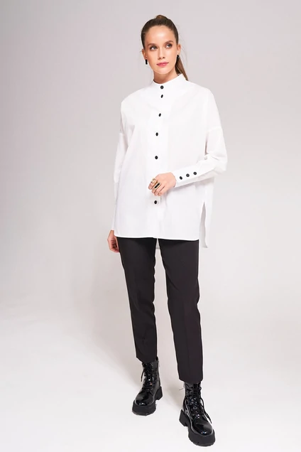 Рубашка-оверсайз со спущеной линией плеча из хлопка. Перед с нагрудными вытачками с застежкой на пуговицах. Рукав рубашечный с приточным удлиненым манжетом с застежкой на пуговицы . Воротник стойка. В бокавых швах ноходятся разрезы с фигурным низом .