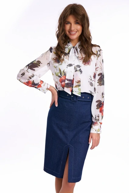 Блуза прямого силуэта, выполненная из шифонового полотна. Воротник-стойка переходящий в бант. Рукава с отрезной манжетой на 3 пуговицы, внизу сборка.