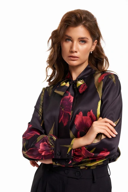 Блуза прямого силуэта, выполнено из атласного полотна. Воротник-стойка переходящий в бант. Рукава с отрезной манжетой на 3 пуговицы, внизу сборка. Длина рукава - 61 см. Длина изделия - 64 см.