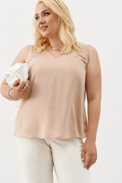 Блузка свободного силуэта из однотонной ткани без рукава на вискозной подкладке. Красивая легкая блузка, слегка расширенная к низу. Стильная вещь, которая отлично сочетается с жакетами, пиджаками и кардиганами. Однотонная блузка станет основой вашего гардероба и разнообразит комплекты повседневной одежды, а также может стать частью вечернего образа.