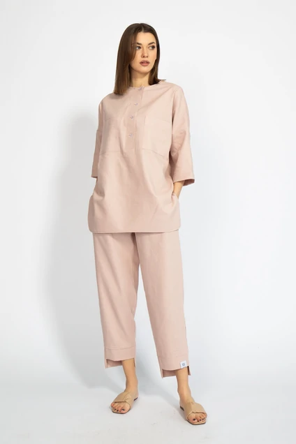 Рубашка лен свободного кроя со спущенными рукавами и накладными карманами, застежкой поло. Удлиненная по спинке, с разрезами в боковых швах. Прекрасно сочетается с шортами модели 4074, брюками модели 4076, джоггерами модели 4082. Ткань лен. Рост 170
