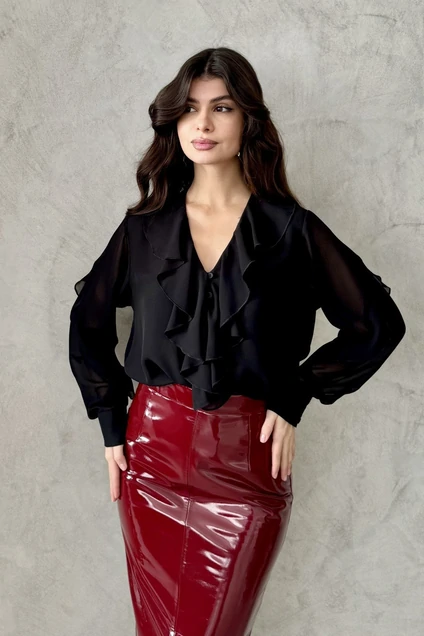 Нарядная блуза из воздушного шифона. Полочка выполнена из двух слоёв ткани( не светит). По центру полочки и горловине переда -воланы. Застёжка на навесные петли и пуговицы. Рукав с декоративным подрезом, в который втачен волан, переходящий на кокетку спинки. Низ на манжете.Длина блузы по спинке 62 см.