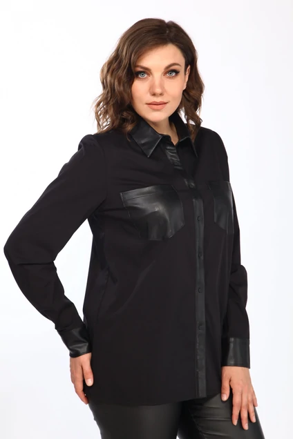 Рубашка женская прямого покроя, застежка центральная на металические кнопки.На передней полке выполнены планка, накладные карманы из эко-кожи.Спинка цельнокроенная.Рукава втачные одношовные с притачными манжетами из экокожи, которые застегиваются на металические кнопки.Воротник отложной со стойкой, выполнен из экоеожи.Длина по спинке 71 см.Бережная стирка при 30 градусах.