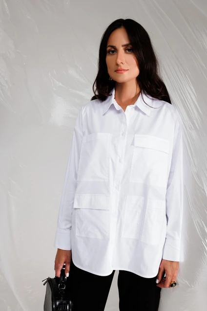Блузка в стиле милитари – тренд этой осени. По переду расположены накладные карманы с клапанами и без, и разной ширины, данная «ассиметрия» визуально будет стройнить вашу фигуру. По спинке расположена кокетка со складками, для удобства движения рук. Застежка спереди на петли-пуговицы. По боковому расположена кулиса, вы можете затянуть вверх шнурочки, завязать их, и у вас будет новый силуэт рубашки. Это лучшая рубашка! Она будет актуальна еще несколько сезонов, а благодаря премиальному хлопку, она не выстирается, не скатается и долго прослужит вам. Длина изделия – 75 см