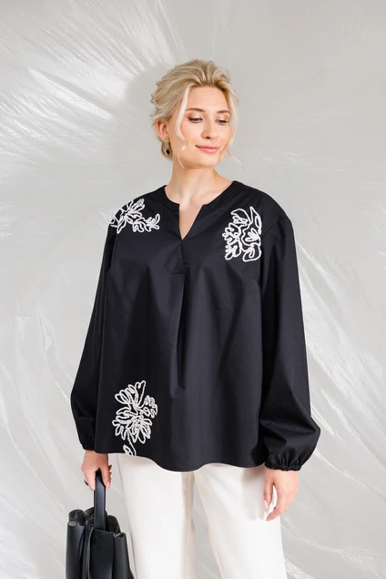 Нарядная хлопковая блузка. По пеоеду расположена вышивка шнуром в виде "абстрактных цветов". Вырез горловины V-образный. Рукав длинный на резинке. По боковым внизу расположены разрезы. Блузка выполнена из премиального гладкого хлопка, не «шелестит». Ткань очень приятная к телу, и легко гладится. К такой блузе отлично подойдут классические брюки или юбка. Повседневность и комфорт – главные преимущества этой блузки. Длина блузки - 68 см