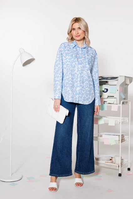 Весенняя блузка с нежно голубым принтом. Блузка прямого кроя, с накладными кармани по переду. Она подойдет для любого случая. Ткань плотная и приятная на ощупь. Длина блузки по спинке - 72 см.