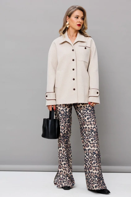 Утепленная рубашка прямого кроя. Накладной карман и паты на рукавах с отделкой шоколадным атласным кантом. Линия плеча спущенная. Длина - 70 см