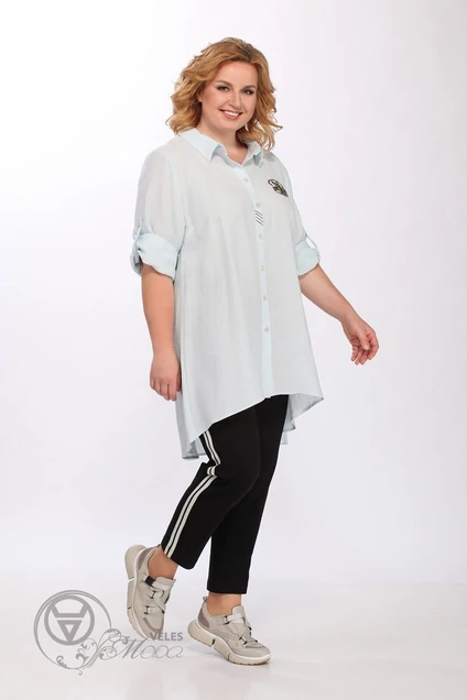 Стильная блузка удлиненного свободного силуэта с рубашечным воротником и застежкой на пуговицы по планке, планка декорирована стразами. Рукав 3/4 на спущенной пройме, подхватывается на хлястик и пуговицу. Спинка на кокетке с декоративным расширением. Длина по спинке 90 см., рукав в развернутом виде 44 см.