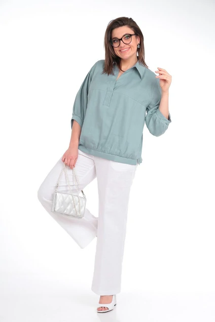 Блузон из натурального умягченного 100% льна свободного силуэта, воротник рубашечного типа на стойке. Вырез декоративная планка, рукав втачной со сборкой на фигурной манжете. Низ на планке с легкой сборкой. длина изделия-66см длина рукава-35см