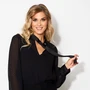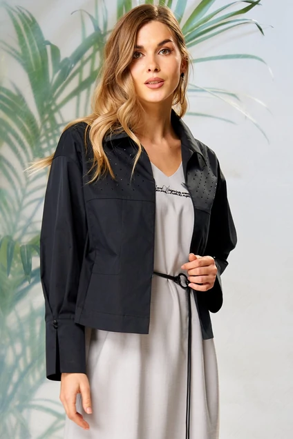Блузка женская, свободного силуэта из натуральной ткани,длиной до линии бедер, со спущенной линией плеча, с втачными рукавами, с втачным воротником, с центральной сквозной застежкой на потайную тесьму-молнию. Детали переда блузки с рельефными швами, исходящими от плечевых швов, центральные части с кокетками, на которых расположена аппликация из декоративных страз. Нижние части с фигурными подрезами, в швах обработаны карманы. Спинка блузки с кокеткой, на нижней части по шву соединения обработаны складки. Рукава втачные одношовные, с широкими манжетами, по шву соединения на рукавах обработаны складки по центру. Манжеты с разрезом, на шве прикреплены декоративно по 2 пуговицы. Воротник сорочечный с цельнокроеной стойкой.