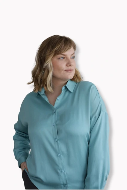 Расслабленная рубашка из вискозы в бирюзовом цвете. Свободный крой, спущенный удлиненный рукав. Ее можно носить как в сочетании с брюками или юбками, так и в паре с платьями.