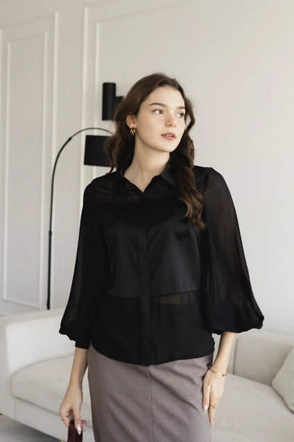 Блуза с эффектом прозрачного шёлка с атласной вставкой по середине, прямого силуэта. Горловина с отложным рубашечным воротником на стойке, пуговицы выполнены на потайной застежке. Рукав пышный и свободный, снизу на манжете. Ткань очень легкая и воздушная. Блуза с легкостью дополнит любой комплект из вашего гардероба: будто жилет с брюками, жакет с юбкой или джинсы.