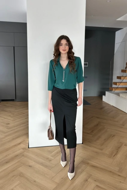 Блузка из новой коллекции — это идеальная находка для любой девушки. Длинный рукав делает её идеальным вариантом для любого сезона, а V-образный вырез с ожерельем из серебристого металла подчеркнет вашу женственность. Эта блузка будет служить вам и в качестве повседневной одежды, и как нарядный предмет гардероба.