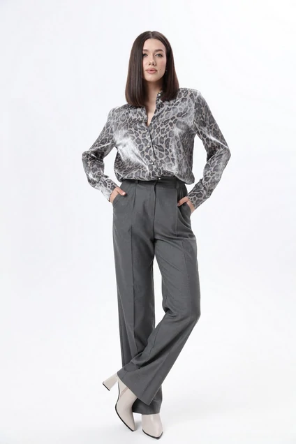 Блузка прямого силуэта с оригинальным принтом из плотной вискозной ткани с металлик- блеском. Воротник рубашечного типа, застежка на прорезные петли и пуговицы. В нижней части рукава заложены складки, манжета на двух пуговицах. Рост фотомодели 175 см. Размер у фотомодели – 44.