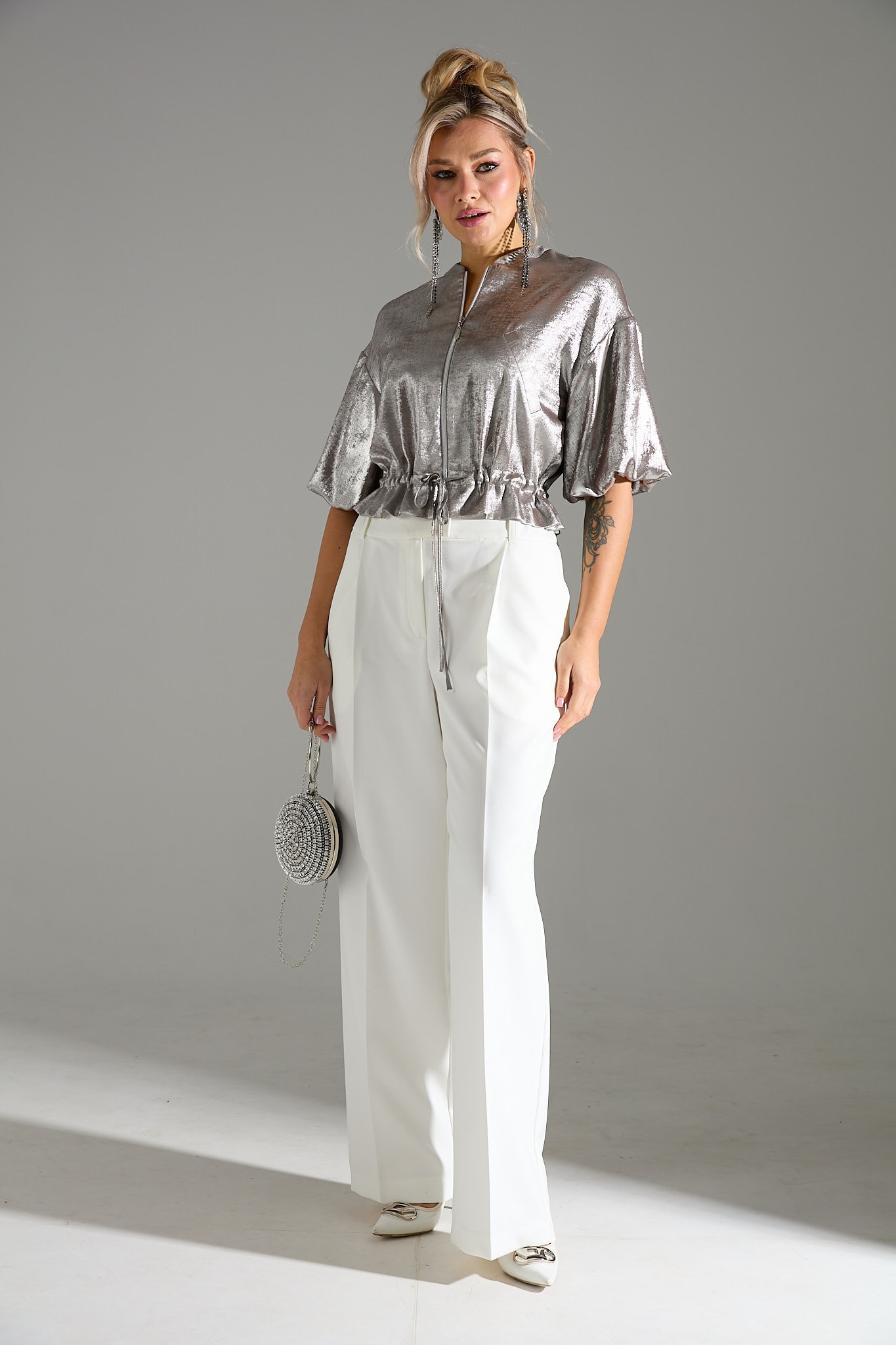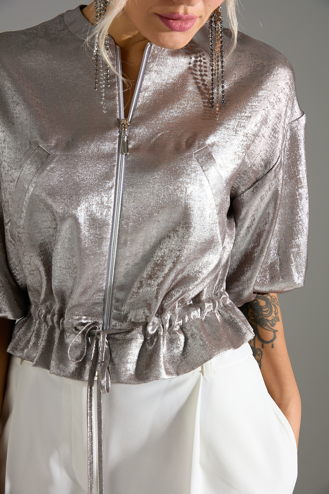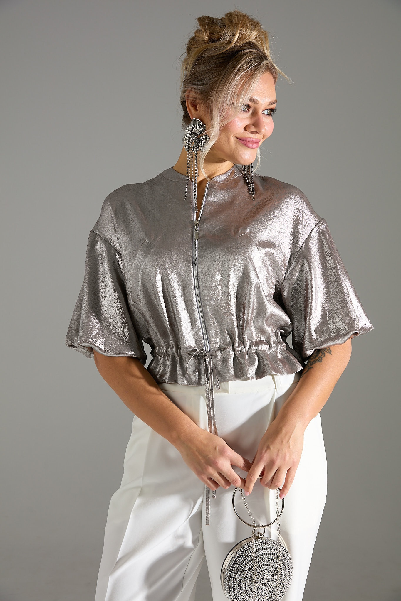 Элегантная блуза серебристого цвета добавит изысканности любому образу. Изделие выполнено из блестящего материала, который прекрасно драпируется и отлично смотрится в свете. В дизайне блузы присутствуют объёмные короткие рукава, добавляющие нотку романтики и изящества. Линия талии на кулисе с завязками из основной ткани позволяет подчеркнуть силуэт. Застёжка на молнию на спине обеспечивает удобство при надевании. Эта блуза будет уместна как для вечернего выхода, так и для создания повседневного, но неординарного образа.