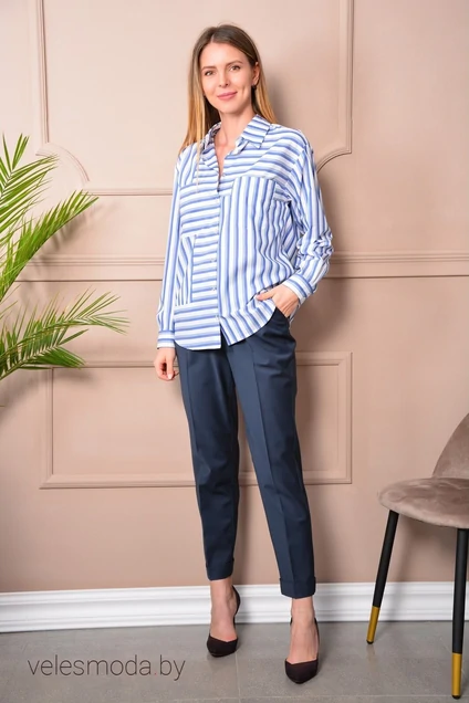 Рубашка свободного кроя без вытачек с накладными карманами. Воротник рубашечного типа с отрезной стойкой и застёжкой на петли и пуговицы по планке. Модель привлекает внимание различным направлением полос на деталях переда. Рукава втачные одношовные.