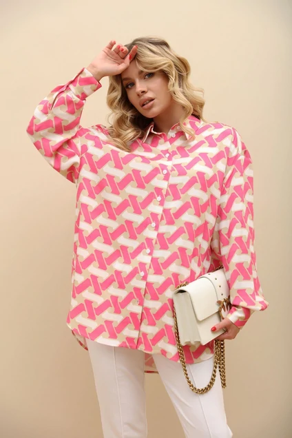 Рубашка большого объема, прямого силуэта. На детали спинки расположена двойная кокетка, переходящая на деталь полочки. Под кокеткой на спинке встречная складка. Воротник рубашечный отложной на стойке. Застежка планка центральная на прорезные петли и пуговицы. Линия плеча спущенная, рукав рубашечный, длинный. Разрез рукава обработан планкой. Низ блузки разноуровневый: спереди короче, сзади длиннее.