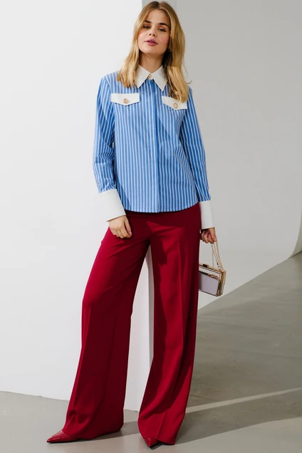 Рубашка полуприлегающего силуэта, выполнена из хлопковой ткани. Потайная застежка на петли и пуговицы. Рукав втачной, по низу рукава манжета. Воротник отложной, рубашечного типа. Перед рубашки с отделкой клапанами. По спинке горизонтальная кокетка и складка. Стойка воротника, манжеты и клапана декорированы золотыми пуговицами.