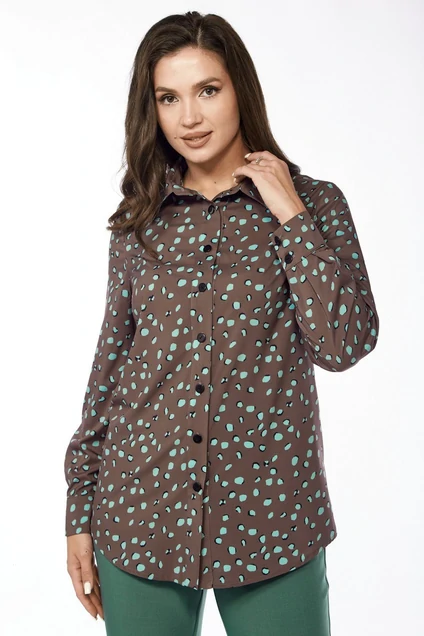 Блузка женская, прямого силуэта. Мультидизайн. Горловина круглая с отложным воротником на стойке. Застежка сквозная на петли и пуговицы. Рукав втачной, длинный с манжетом на застежку. Низ рукава оформлен манжетой на петли и пуговицы. Низ изделия фигурный.