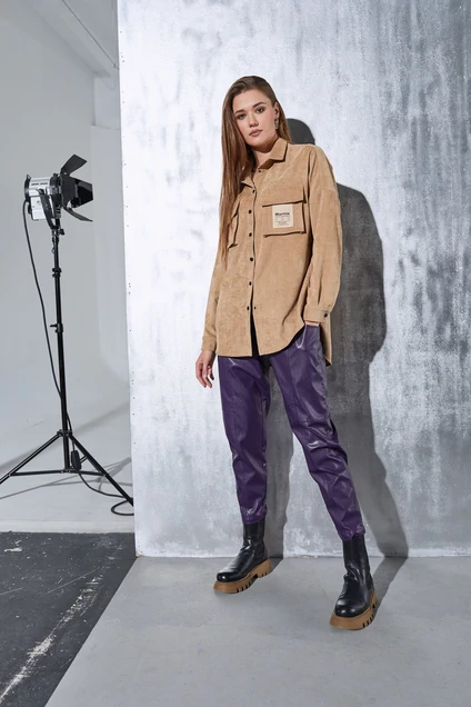 Рубашка прямого свободного кроя с центральной застёжкой на кнопки.Перед с накладными объёмными карманами''портфель''.Спинка с кокеткой.Рукав обработан притачной манжетой на кнопку.Воротник рубашечного типа. длина изделия -81см