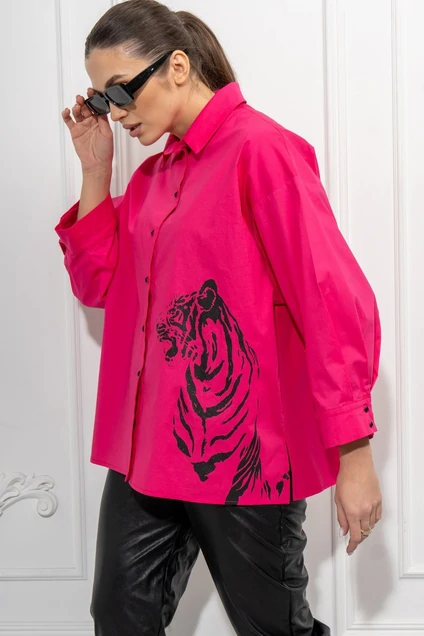 Рубашка прямого свободного кроя с центральной застёжкой на петли-пуговицы.Перед с печатью.По спинке бантовая складка.Рукав на притачной манжетой на петли-пуговицы.Воротник рубашечного типа.