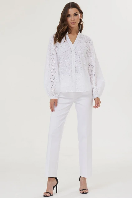Стильная блузка прямого силуэта из ришелье с фигурным низом. Горловина V-образная с застежкой на петли и пуговицы. Рукав втачной длинный, по низу манжета с застежкой на петлю и пуговицу. В комплект входит топ на регулируемых бретелях.