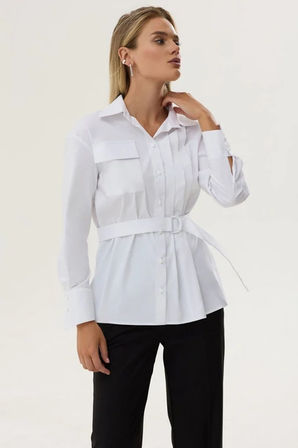 Стильная блузка прямого силуэта из хлопковой ткани. Воротник рубашечного типа. Перед блузки с притачной планкой с застежкой на петли и пуговицы. На правой половине переда располагается накладной карман с декоративным клапаном. На левой половине переда располагаются три декоративные складки шириной 3 см. каждая. Складки застрочены частично, строчка заканчивается под линией груди. Спинка без особенностей. По боковым швам разрезы. Рукав со спущенной линией плеча, по низу фигурный манжет с застежкой на петли и пуговицы. В комплект входит съемный пояс из основной ткани.