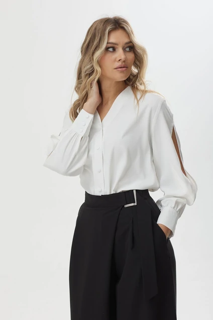 Стильная блузка прямого силуэта из струящейся ткани. Горловина с V-образным вырезом с застежкой на петли и пуговицы. Рукав втачной с вырезом, по низу манжета на петлю и пуговицу.Длина блузки: (59см-44-48рр)(61см-50-54рр)( 63см-56-60рр)