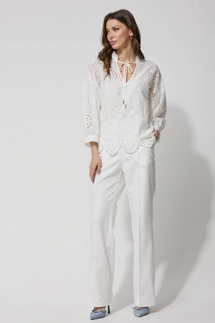 Нарядная блузка прямого силуэта из ришелье с фигурным низом. Горловина v- образная на стойке с декоративной рюшей и завязками. Рукав со спущенной линией плеча, по низу манжета с застежкой на петлю и пуговицу. В комплект входит нижний топ из хлопка. Обращаем ваше внимание, что фурнитура может незначительно отличаться от фото. Длина изделия: (44-48р - 61см), (50-54р - 64см);
