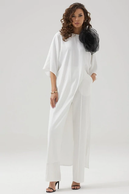Ассиметричная блузка прямого силуэта из струящейся ткани. Горловина округлая, на спинке застежка на петлю и пуговицу. Рукав цельнокроенный. В комплект входит съемная брошь из органзы. На фото модель представлена с брюками Артикул 3760 Длина изделия: 130см