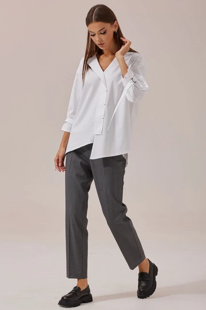 Блузка прямого силуэта из хлопковой ткани с фигурным низом по переду. Вырез V-образный со стояче-отложным воротником, с ассиметричной деталью по центру. Рукав втачной одношовный, со спущенной линией плеча, по низу рукава декоративный элемент, позволяющий регулировать ширину рукава. Спинка с кокеткой и складками. Длина блузки: (44-48р -69см)(50-54р – 73см)(56-60р - 77см)