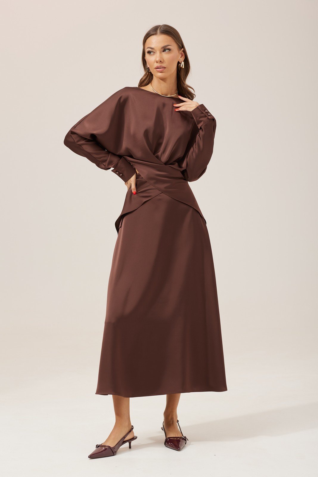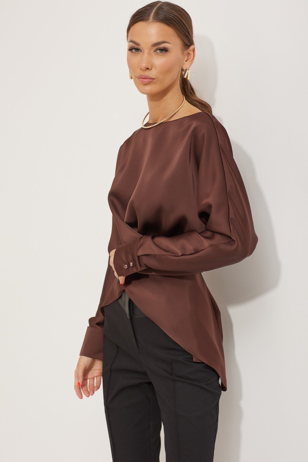 Нарядная блузка прямого силуэта с фигурным низом из струящейся ткани. Горловина округлая на спинке застежка на петлю и пуговицу. Рукав цельнокроеный по низу манжета с застежкой на петлю и пуговицу. В комплект входит съемный пояс из основной ткани для регулирования степени прилегания. Длина блузки (44-48см – 67см)(50-54р - 68см)